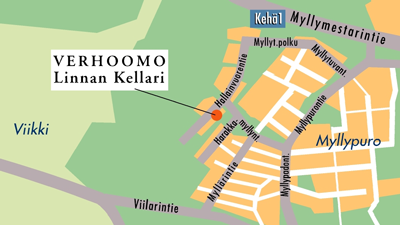 Verhoomo Linnan Kellari sijaitsee Myllypuron pientaloalueella, Viikin metsän kyljessä. Rohkeasti vain peremmälle, Hallainvuorentie 12 pihan läpi, käytävää pitkin keltaisen paritalon ohi, oikealle Linnan Kellarin portaita kohti!